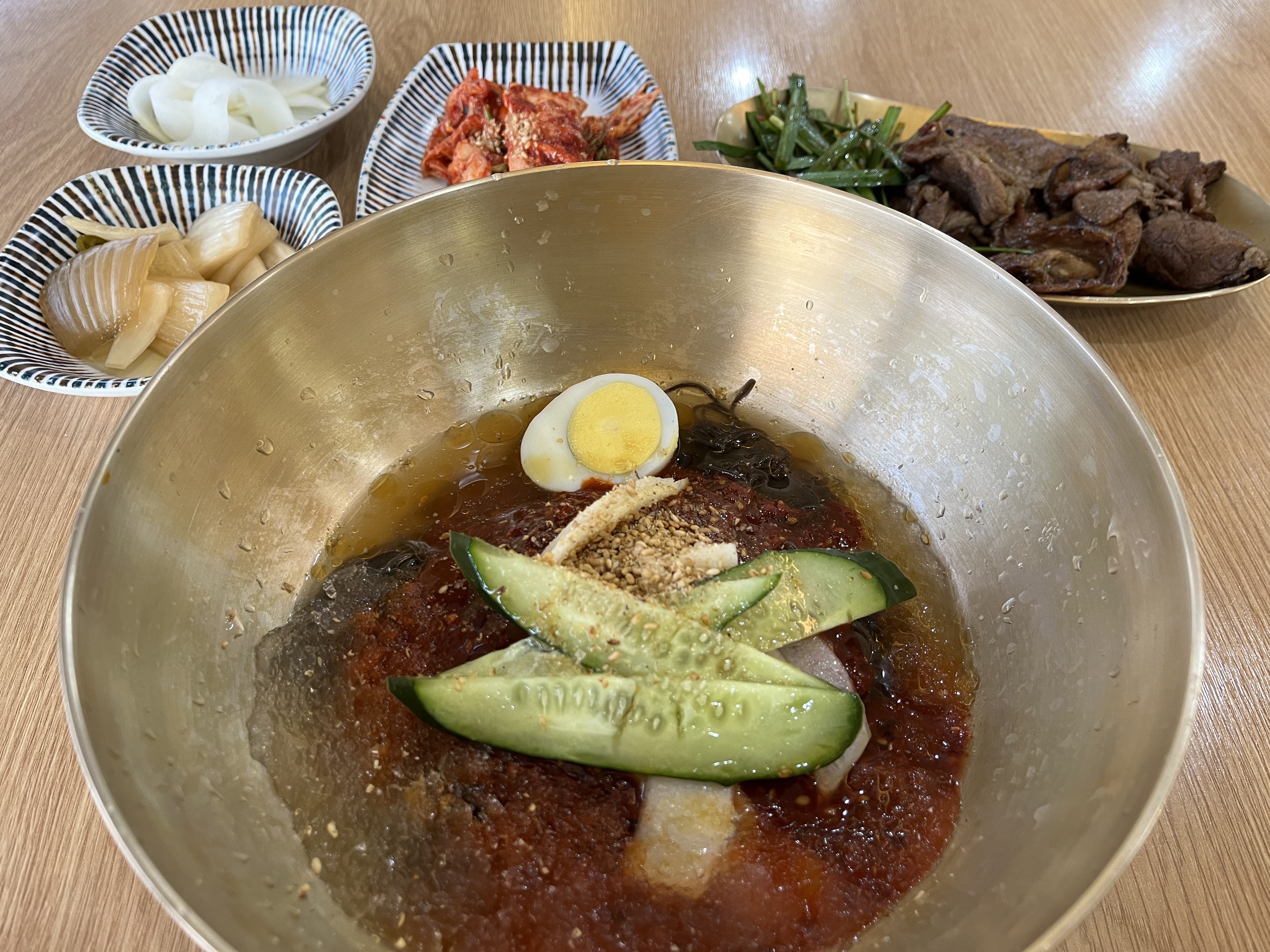 (2025-03-30) 광주 주월동 숙소 인근 명인면옥 비빔냉면. 냉면에 소주는 처음인 듯