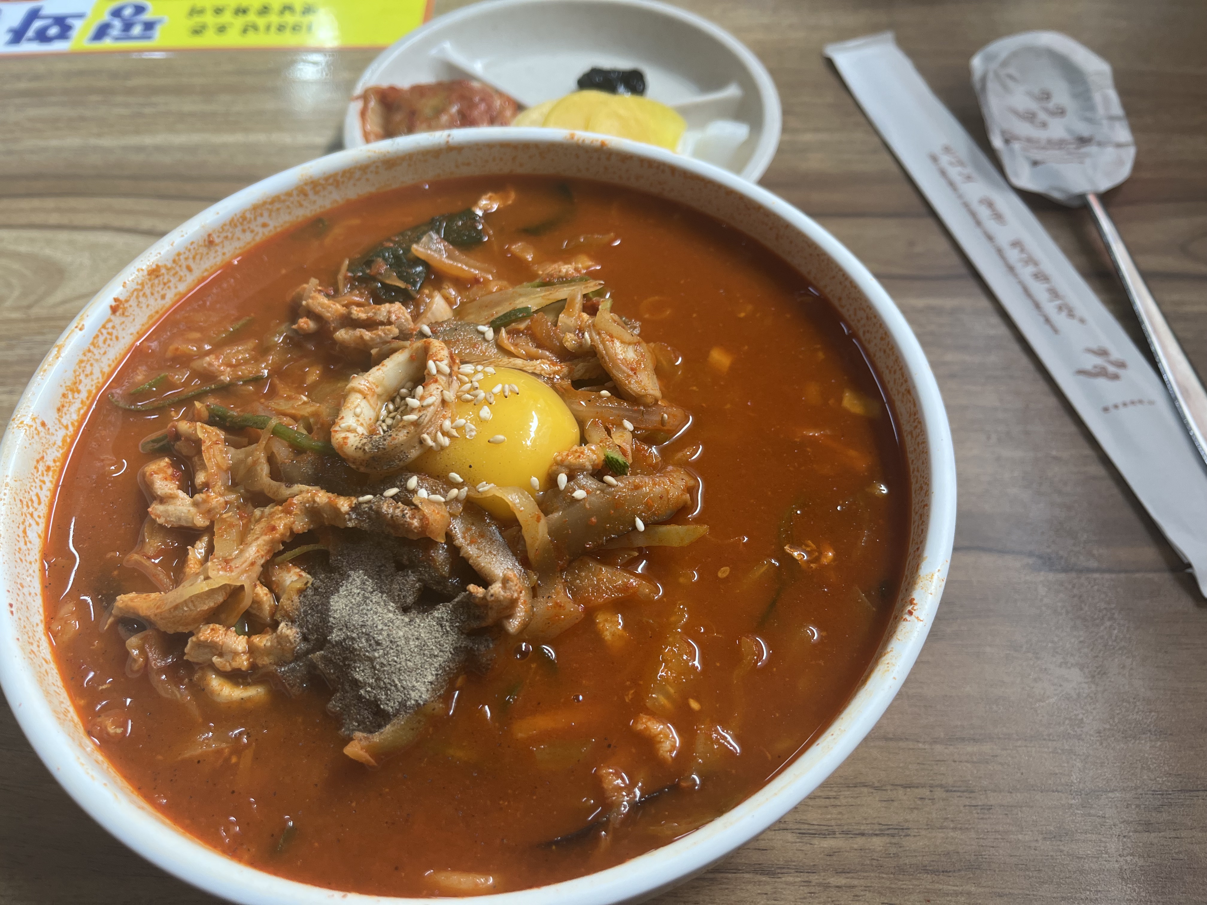 (2025-03-31) 숙소에서 1시간 가량 걸어가 점심으로 해결했던 광주역 평화반점 매운짬뽕. 이렇게 매운짬뽕은 처음이다. 하지만 맛은 있어서 견딜만하달까. 견딜만하긴, 건더기만 먹어놓고는.